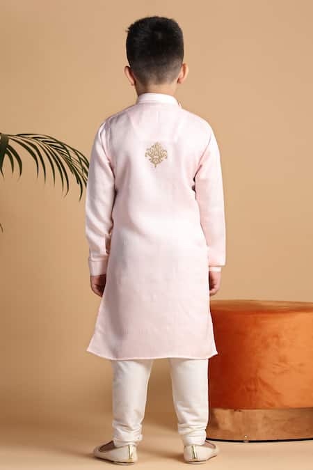 Baby pink kurta featuring a Mandarin collar, full sleeves, and gold placement embellishment. Paired with a matching churidar and side slits for added style.