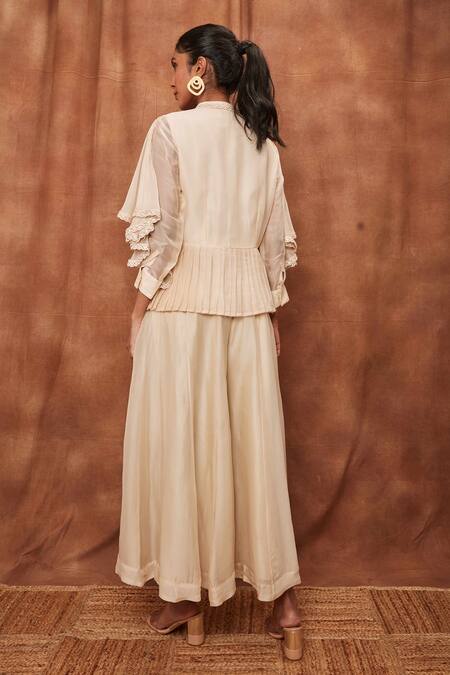Cream Silk Organza Chinnon Round Overlay Ruffle Top And Flared Pant Set