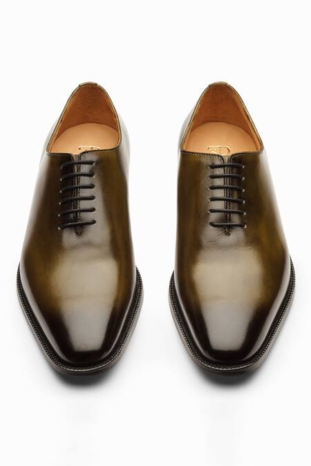 Black, olive, gold oxford shoes in leather base with hand built Argentinean leather sole, rich tan leather lining and French raw white crust leather painted with patina finish.