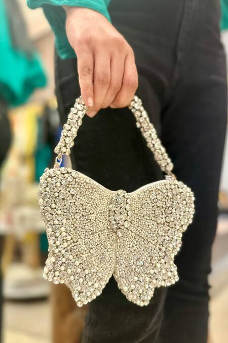 Silver handbag featuring a bow shape adorned with rhinestone embellishments