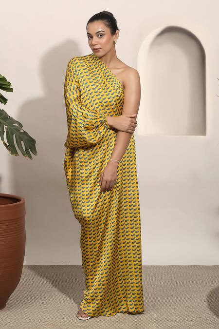 Yellow Modal, Satin One Shoulder Dolce Printed Kaftan
