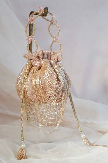 Rose gold potli bag crafted in sequin net base with all over sequin encrustments