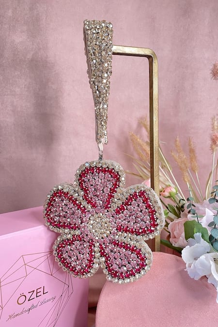 Pink mini flower shaped handbag featuring rhinestone embellishments and an intricately embroidered handle