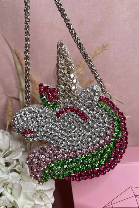 Pink unicorn shaped mini bag featuring rhinestone studded embroidery