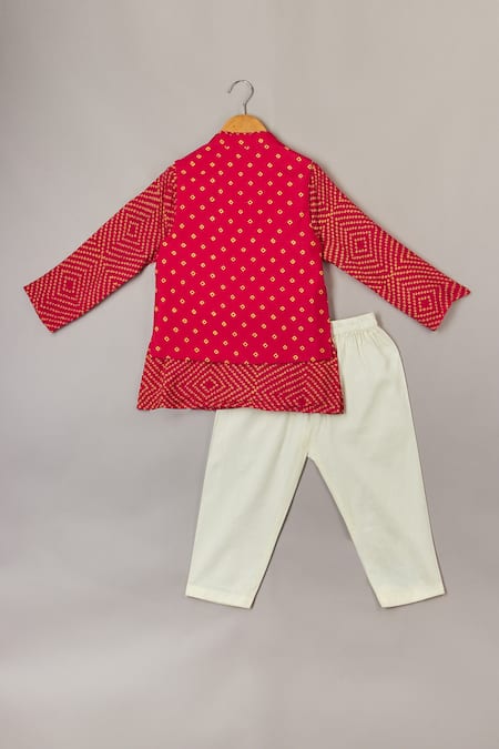 Pink kurta set featuring a bandhani print with a mandarin collar and full sleeves. Paired with a sleeveless bundi and elasticated pyjama.