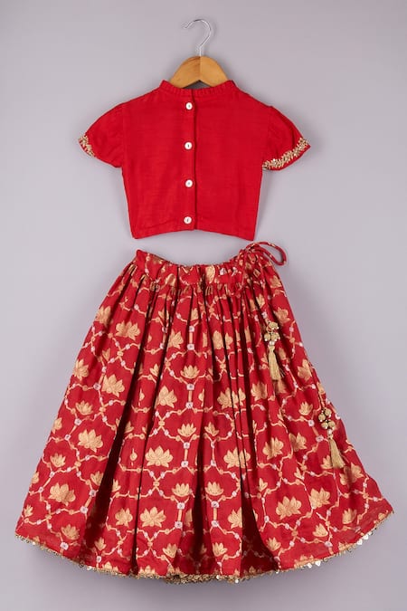 Red Silk, Brocade Sequins, Zari Lotus Lehenga And Choli Set