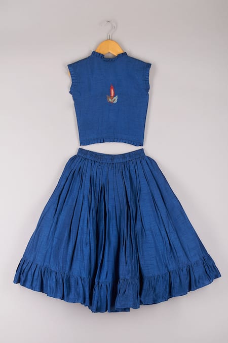 Blue silk embroidered choli featuring lotus thread work. Paired with a tiered lehenga with an elasticated waist.