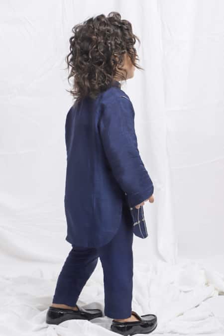Blue kurta featuring full sleeves and metallic stripe embellishments. Paired with matching pant for a complete look.