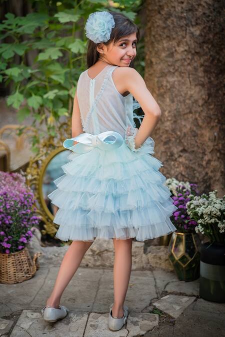 Blue Tulle Hand Embroidered Floral Bodice Dress