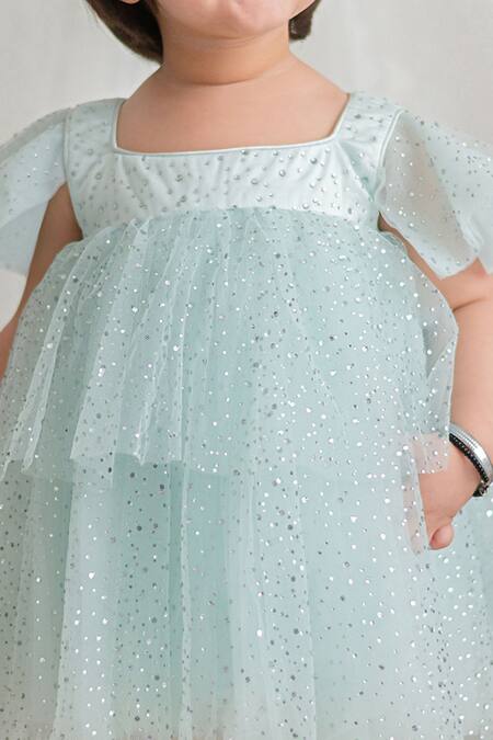 Sea green tulle layered dress featuring diamante embroidery and ruffled sleeves