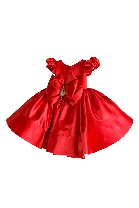 Red layered and flared dress featuring floral applique embroidered motifs and puff sleeves
