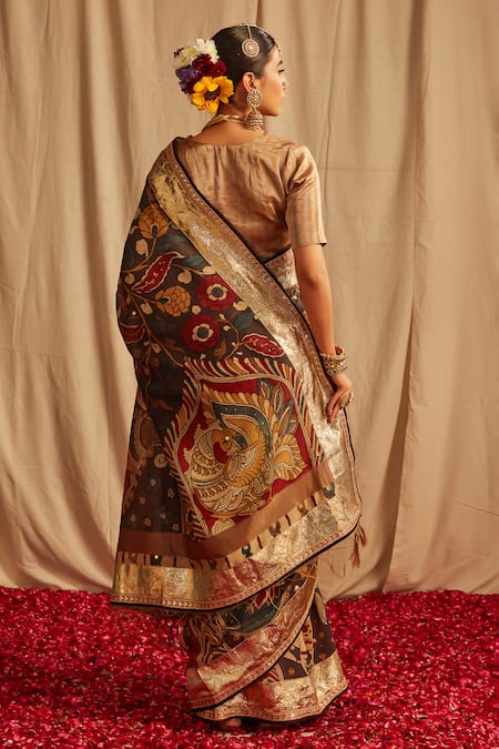 Black Silk Gota Patti Kalamkari Print Saree With Running Blouse Piece