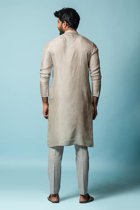 Mirage grey bamberg silk kurta in leaf embroidered motifs. Paired with solid cotton pant.