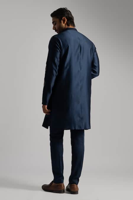 Navy blue chanderi kurta featuring thread embroidered floral patterns with beadwork. Paired with matching pant pajama in cotton.