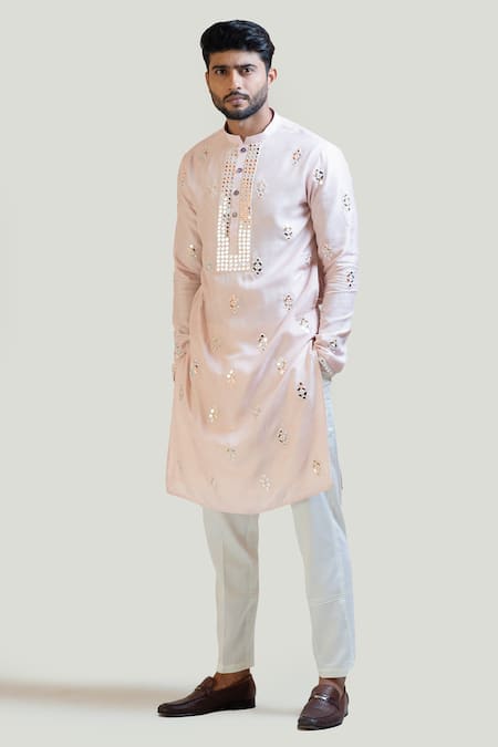 Pastel pink kurta highlighted with all-over mirrorwork embroidery on the front body and the sleeves. Paired with a cream narrow fitted pajama pant.
