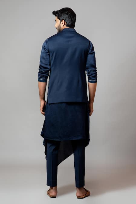 Navy blue layered bundi with honeycomb pattern embroidered motifs & cutdana work. Paired with draped kurta & churidar.