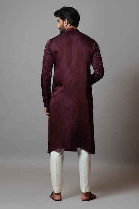 Ruby wine linen satin embroidered kurta in mirror work. Paired with solid pant.