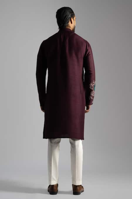 Maroon kurta featuring thread embroidered floral motifs highlighted by beads. Paired with a matching pant in cotton fabric.