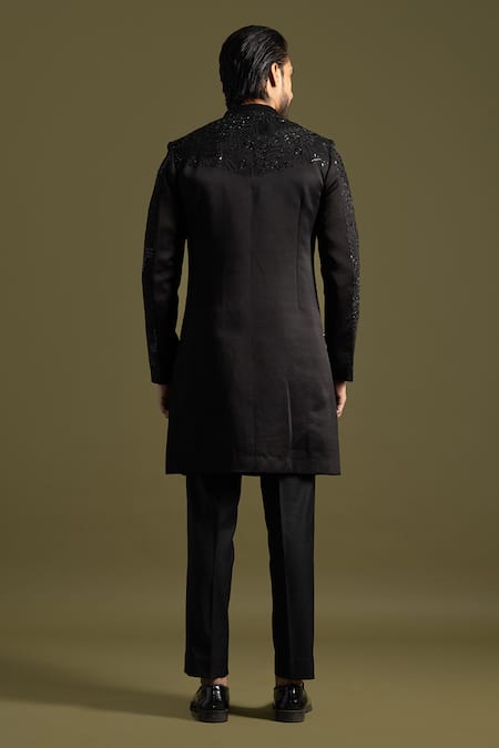 Black achkan featuring full sleeves, mandarin collar, and intricate gardenia thread, chir, beads, and sequin embroidery. Paired with a matching trouser for a complete look.