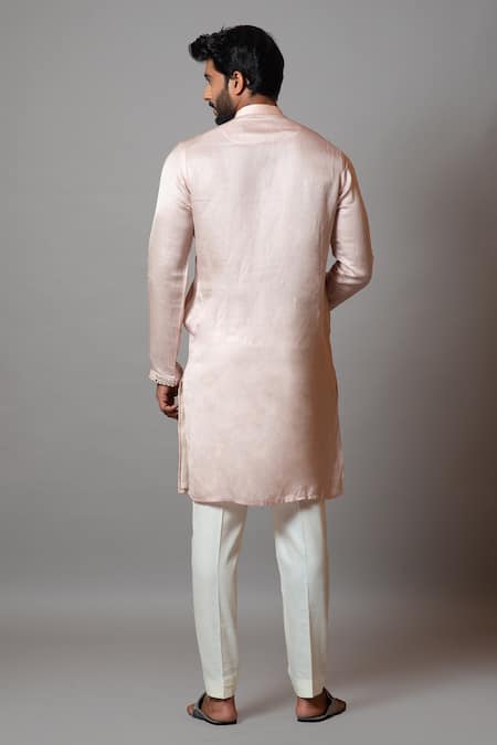 Sweet pink linen satin kurta with mirror work embroidered placket. Paired with solid pant.