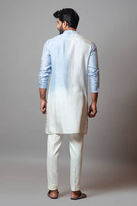 Alaskan blue, ivory kurta with mirror work embroidery & front buttons. Paired with slim fit pyjama pant.