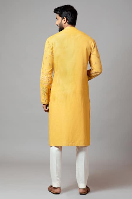 Mustard yellow straight kurta with placement red-tone floral motif embroidery. Paired with cream pajama-pants.