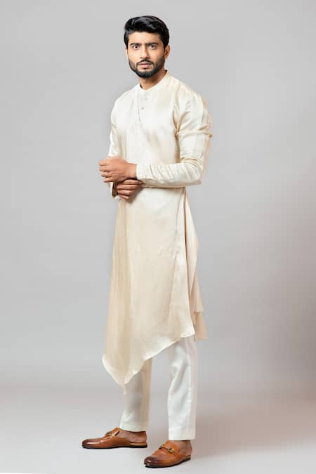 Champagne long kurta with asymmetric hem, button placket & placement embroidered sleeves. Paired with cream pajama-pants.