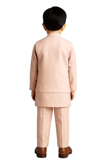 Onion pink nehru jacket featuring geometric patterns and a front closure. Paired with a coordinating kurta and pant made from malai cotton.