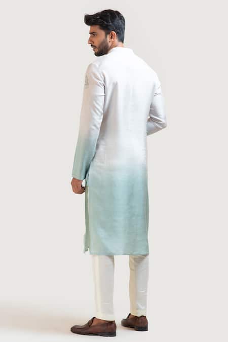 Ombre shaded kurta in the tone of grey to mint green highlighted with motif embroidery on the sleeves. Paired with a cream narrow fitted pajama pant.