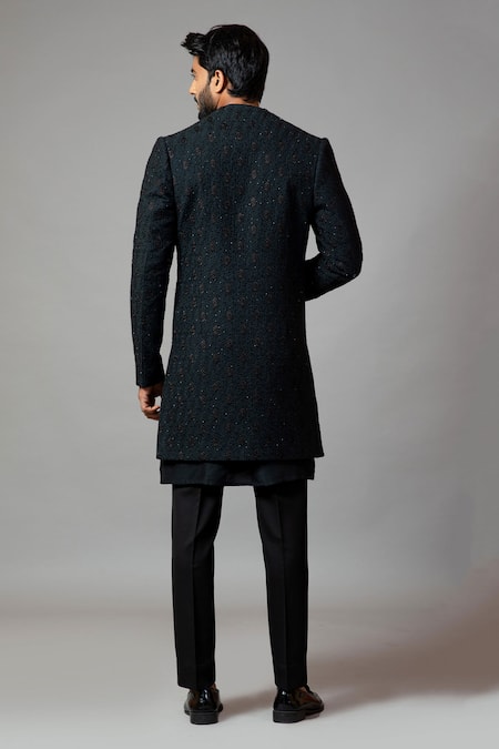 Black layered sherwani with double panels & all over cheeta katdana work. Comes with a bullion leaf embroidered kurta and slim fit pajama-pants.