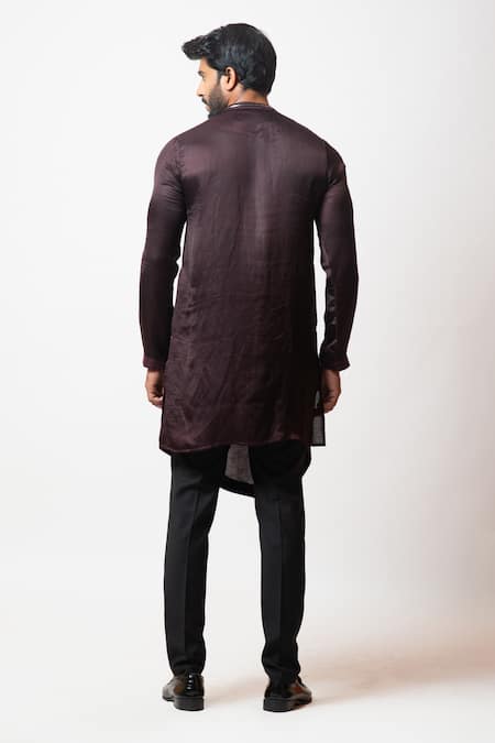 Windsor wine linen satin asymmetric kurta with embroidered detail. Paired with solid pant.
