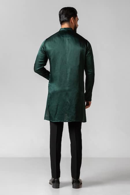 Verdant green kurta featuring a mandarin neckline and pintuck detailing. Paired with solid straight pants crafted from malai cotton.