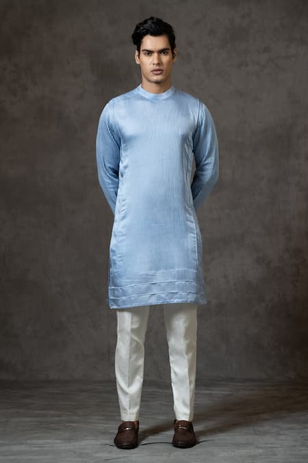 Powder blue linen satin kurta featuring all over pintuck details, band collar, and cord piping border. Paired with buttercream malai cotton slim fit pyjama.