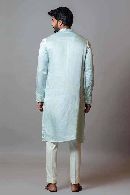 Ice blue kurta in linen satin with mirror work and highlights of chain stitch. Paired with narrow fitted pyjama pant.