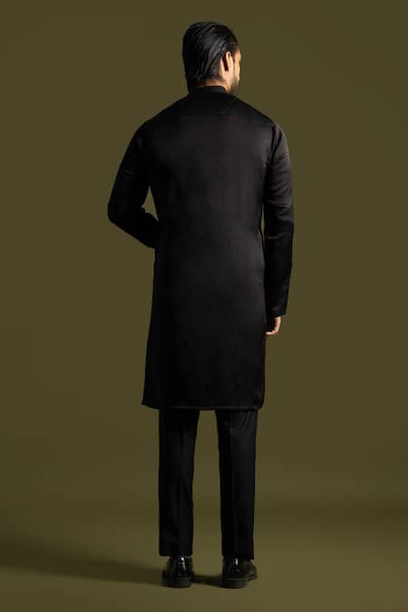 Black kurta featuring full sleeves and round collar with front body smocked panel detailing. Paired with matching trousers for a complete look.
