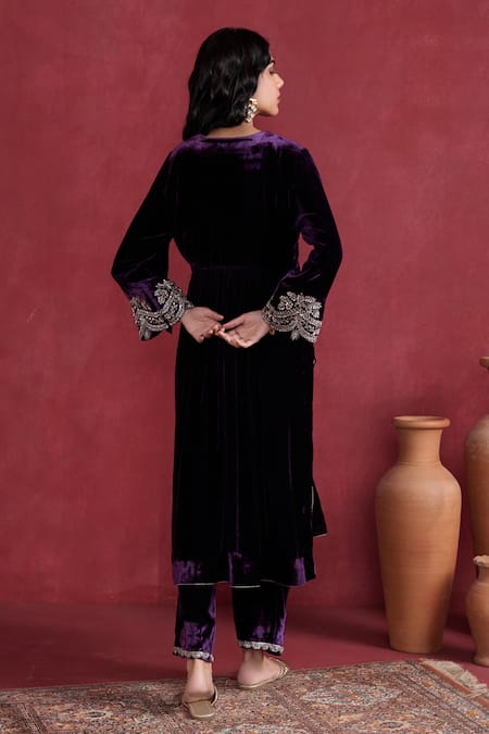 Purple Kurta And Pant Premium Silk Velvet Embroidery Flowery V Aliya Cut Set