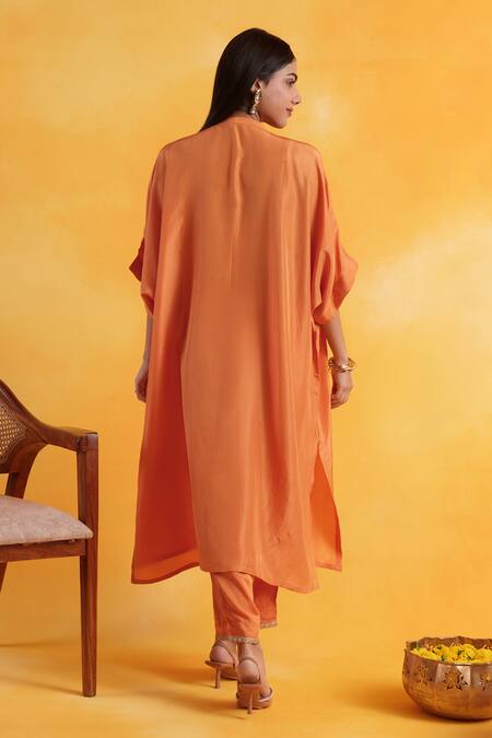 Orange kaftan featuring dolman sleeves, round collar, and asymmetric hem in premium silk. Paired with straight cotton silk pant with embroidered hem details.