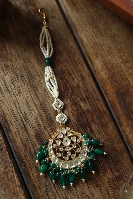 Buy_Paisley Pop_Green Flower Motif Carved Maangtikka _Online_at_Aza_Fashions