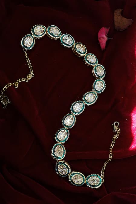 Encrusted kundan stones, Green enamelling accents, Oval motif design