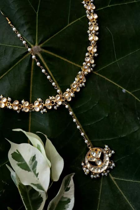 Gold mathapatti featuring kundan crescent moon and pearl detailing