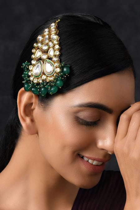 Gold passa featuring intricate kundan work with teardrop motifs and stone drops