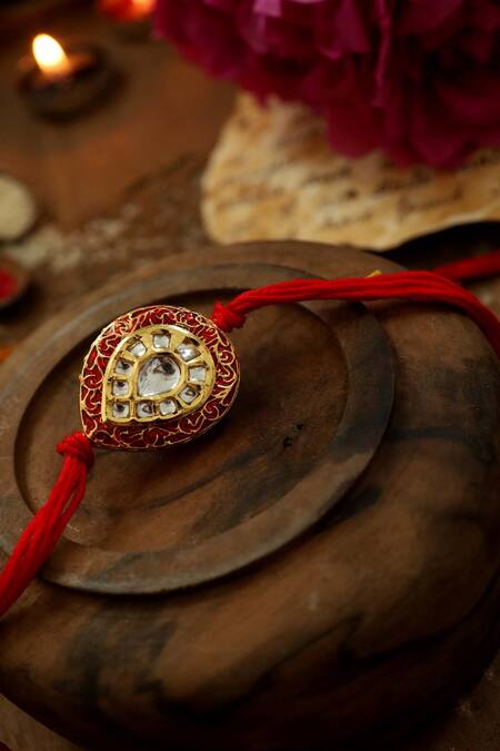 Red multi-threaded rakhi featuring a gold plated teardrop enamelled motif encrusted with kundans