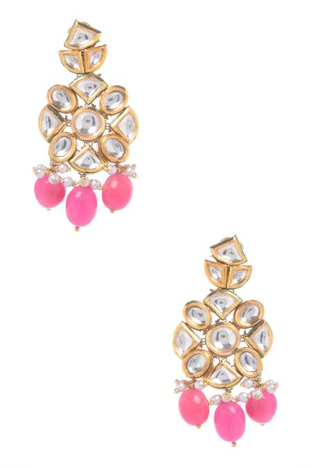 Encrusted kundan stones in a floral pattern, Green enamel detailing, Pink bead drops for added elegance