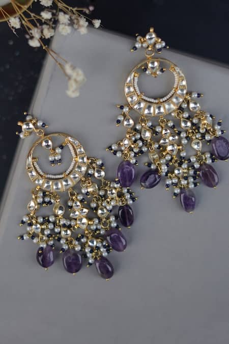 Crescent shaped design with intricate kundan work, Lined with white beads and bordered with amethyst stones, Gold plated finish with a luxurious appeal