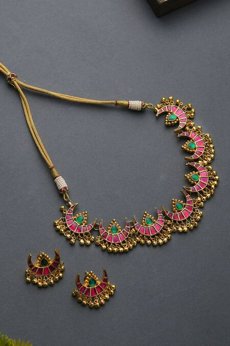 Gold Kundan choker featuring crescent moon motifs with ghunghroo drops. Paired with matching stud earrings adorned with intricate details.