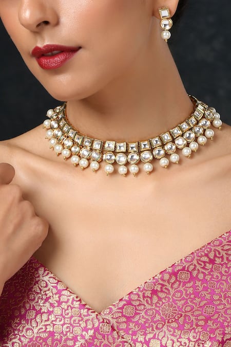 Gold choker featuring kundan work with pearl drops. Paired with matching earrings having push back clasp.