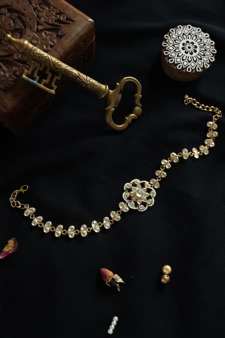 Gold choker necklace featuring a floral design embellished with kundan stones