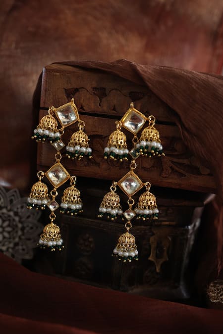 Gold jhumka earrings featuring intricate kundan stone and pearl embellishments