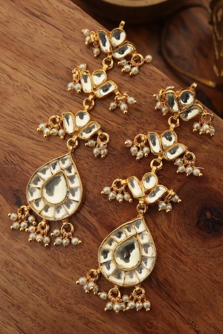 Intricate Kundan stone arrangement, Teardrop shaped design, Pearl embellishments for added elegance