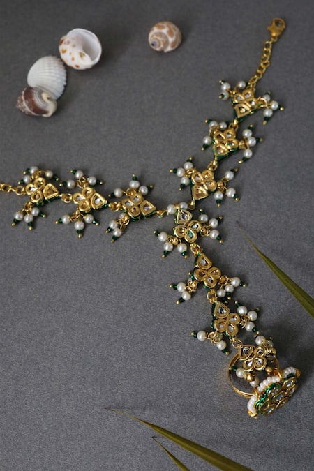 Gold plated hathphool featuring floral motifs adorned with kundan, cluster shell pearls, and green enamelling
